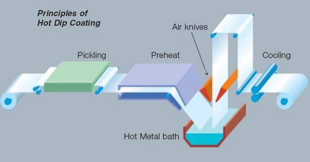 鋼板以連續前進的方式通過熔融的鋅(鋅合金)浴槽實現表面熱浸鍍,其鋼板表面酸清洗預處理、溫度控制和鍍層厚度控制都是以自動化方式進行的。