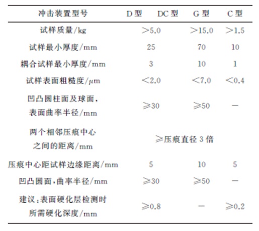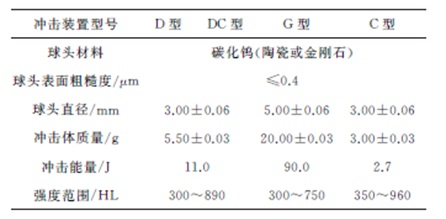 ? ? ?表1中相同的彈性模量采用不同材料選項,是因為表中的E是材料宏觀、靜態的彈性模量,由于金屬中的合金元素及各種化合物在冶金和熱處理過程中會形成多相、彌散、高彈性模量的微觀組織,使材料的動態力學性能發生變化,會使對彈性模量很敏感的里氏硬度發生變化,而不同于基體材料的里氏硬度。通常高合金含量材料會有較高的彈性模量,因此相同彈性模量的鋼材中能夠劃分出合金含量從低到高的2~3種選項。 1.2.2 沖擊裝置的選用 為適用于各種現場環境檢測,里氏硬度計的沖擊裝置型號較多,不同型號具有不同用途,全部型號包括:D型、DC型、S型、E型、D+15型、DL型、C型、G型。其中D型沖擊裝置屬于通用型,通常作為標準配置,用于普通金屬樣品的硬度檢測;DC型沖擊裝置短小,采用特殊的加力環,其他參數與D型沖擊裝置幾乎一致,應用于較小空間的硬度檢測,如孔內、圓柱筒內等;G型沖擊裝置球頭直徑較大,其沖擊能量較高,對被測物表面質量要求較寬泛,適用于表面較粗糙的零件及大型鑄件和鍛件的硬度檢測;C型沖擊裝置較短,沖擊能量約為D型裝置的1/4,適用于表面硬化層、薄層及質量較小的被測物檢測。常用的4種沖擊裝置技術參數見表2。表2 常用沖擊裝置技術參數
