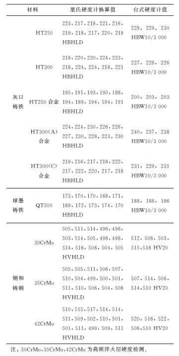 1.3?檢測結果 根據GB/T 17394.1—2014的要求,里氏硬度試驗應至少進行3次,并計算其算數平均值。如果硬度相差超過20HL,應增加試驗次數,并計算算術平均值。 沒有將里氏硬度檢測結果換算成其他硬度的準確且普遍適用的方法,除非通過對比試驗得到相關的換算依據,否則應盡量避免里氏硬度換算。當應該進行換算時,對于常用金屬材料可參照GB/T 17394.4—2014進行換算。 在里氏硬度符號前示出硬度數值,在后面示出沖擊裝置類型,如600 HLD。對于里氏硬度換算其他硬度的標識,GB/T 17394.1—2014中沒有明確規定,通常在里氏硬度符號之前給出相應的硬度符號,如600 HBHLD。 2 里氏硬度計的校準 2.1 校準條件 被校準材料應該取自試樣基體或熱處理條件相同的同牌號試樣,試樣需加工成?100mm、厚度55mm的圓形樣塊。校準面與支撐面需保證平行度不大于0.1mm,校準面Ra不大于0.8μm;支撐面Ra不大于1.6μm。G型硬度計校準試樣質量需大于15kg。 2.2 校準方法 按GB/T 17394.4—2014的技術要求進行里氏硬度檢測,取15個點的算數平均值作為里氏硬度計檢測值用于校準,根據實際情況可減少檢測點。以相關洛氏、布氏、維氏等硬度標尺的標準試驗方法進行被校準物檢測,并至少檢測4點,取算數平均值為檢測值。計算兩次檢測結果算數平均值之間的偏差可得到補償值,即補償值(偏差值)等于標準硬度算數平均值減去里氏硬度算數平均值。 2.3 校準結果 研究人員將從事現場檢測遇到的材料校準匯總于表4,包括灰口鑄鐵、球墨鑄鐵、高頻淬火件等檢測結果的對比。表4 不同材料硬度檢測結果及換算值對比