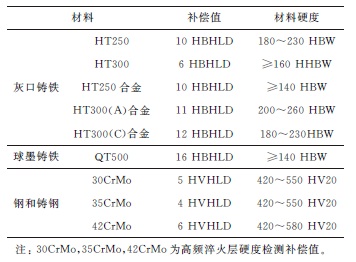 ? ? ?將表4檢測結果的算數平均值按該文3.2節校準方法進行計算,得到以下材料牌號換算時的補償值,見表5,并注明了校準材料基體的硬度范圍,以提高參考價值。表5 不同材料的里氏硬度換算補償值